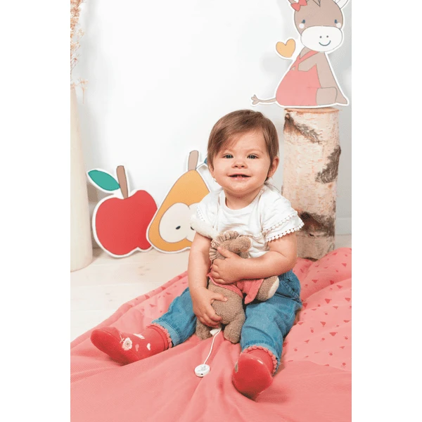 Het schattige ezeltje Emmily in lichtbruin en lichtrood is gemaakt van knuffelige fluffy stof, Nicki en poly cotton . Het trendy rode shirtje en het schattige geborduurde perenmotiefje op het beentje maken van Emmily een echte blikvanger. Dankzij de praktische afmetingen van 20 cm is het middelgrote muziekdoosje ideaal voor de allerkleinsten en gemakkelijk vast te pakken, maar ook interessant voor oudere kinderen en een goede vriend om mee te spelen en te knuffelen. De populaire melodie “You are my sunshine” kalmeert je kleine schat en zorgt voor een zacht inslapen.