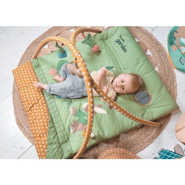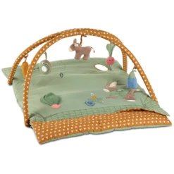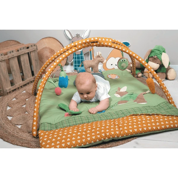 De speelboog met het motief Emmilius de ezel is gemaakt van poly cotton . De rammelaar, pieper, knisperend papier en spiegelfolie prikkelen de zintuigen van uw kleine lieveling. De figuren zijn ook verwijderbaar.