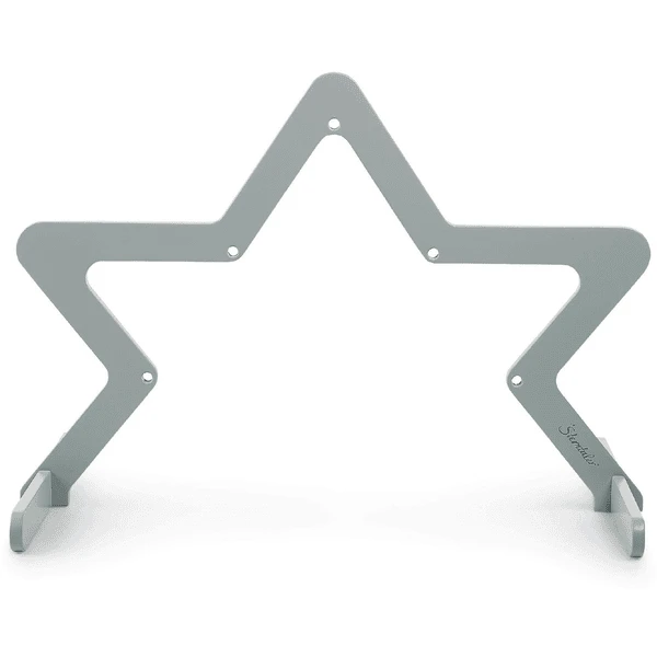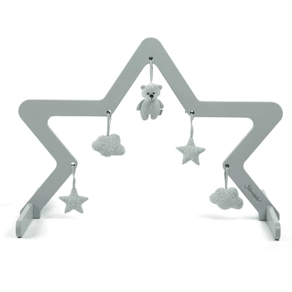 Speelboog houten ster (grijs) van Sterntaler. Op verschillende hoogtes zijn er bevestigingsmogelijkheden voor verschillende speelstukken, die steeds opnieuw kunnen worden geruild. Dit zorgt voor flexibiliteit en afwisseling.