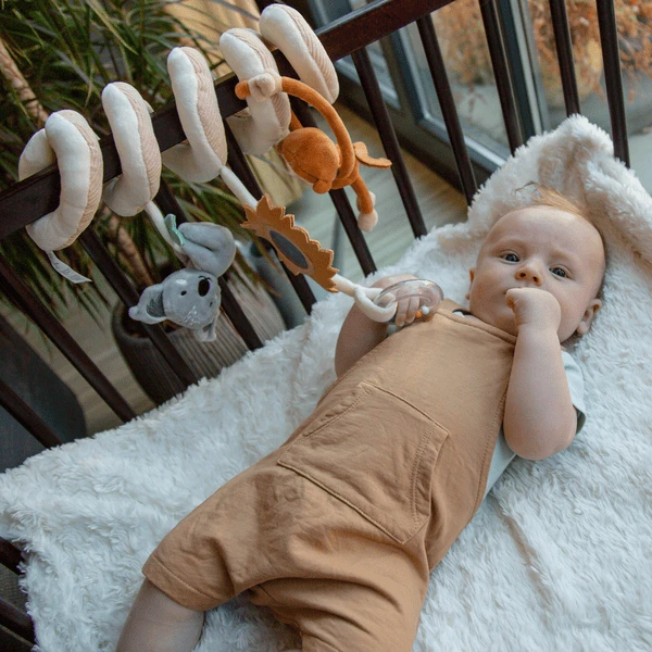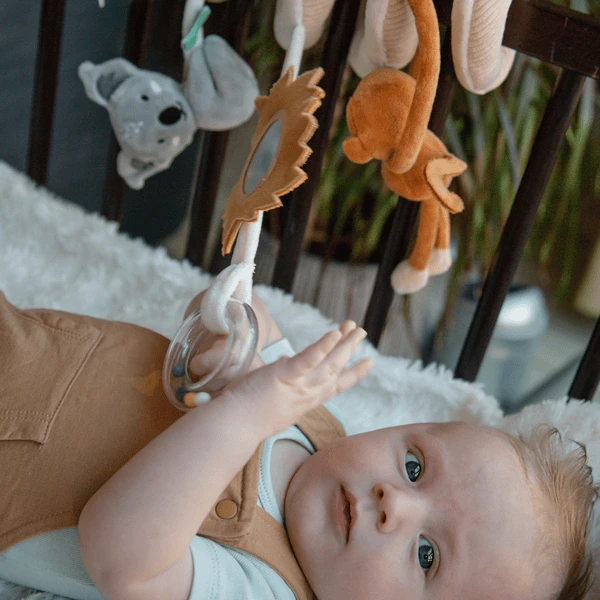 - De Spiral e is eenvoudig te bevestigen aan de box, het ledikant, de kinderwagen of de autostoel.